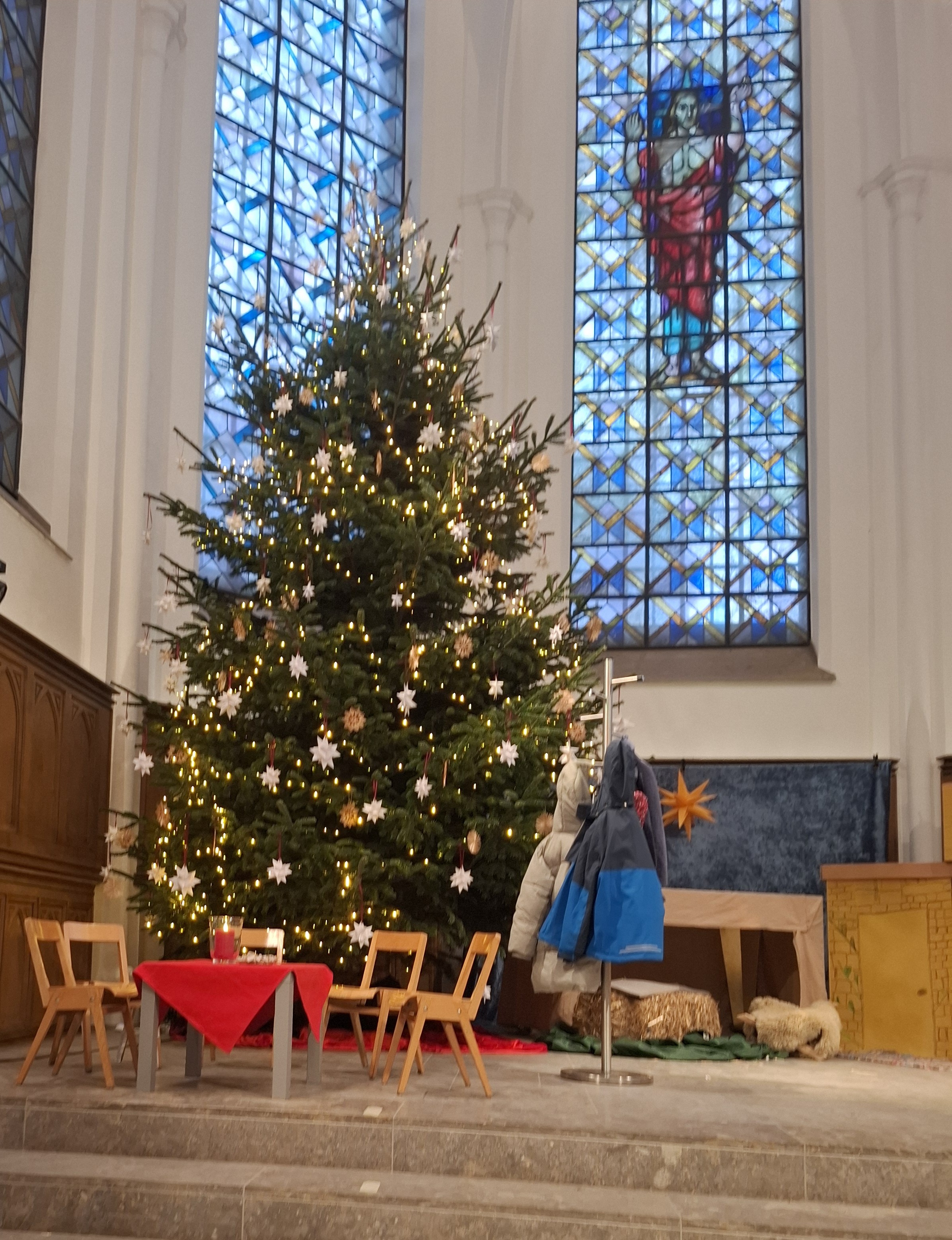 Geschmückter Weihnachtsbaum im Altarraum der Stadtkirche Moers. Davor ein Tisch und 5 leere Stühle.